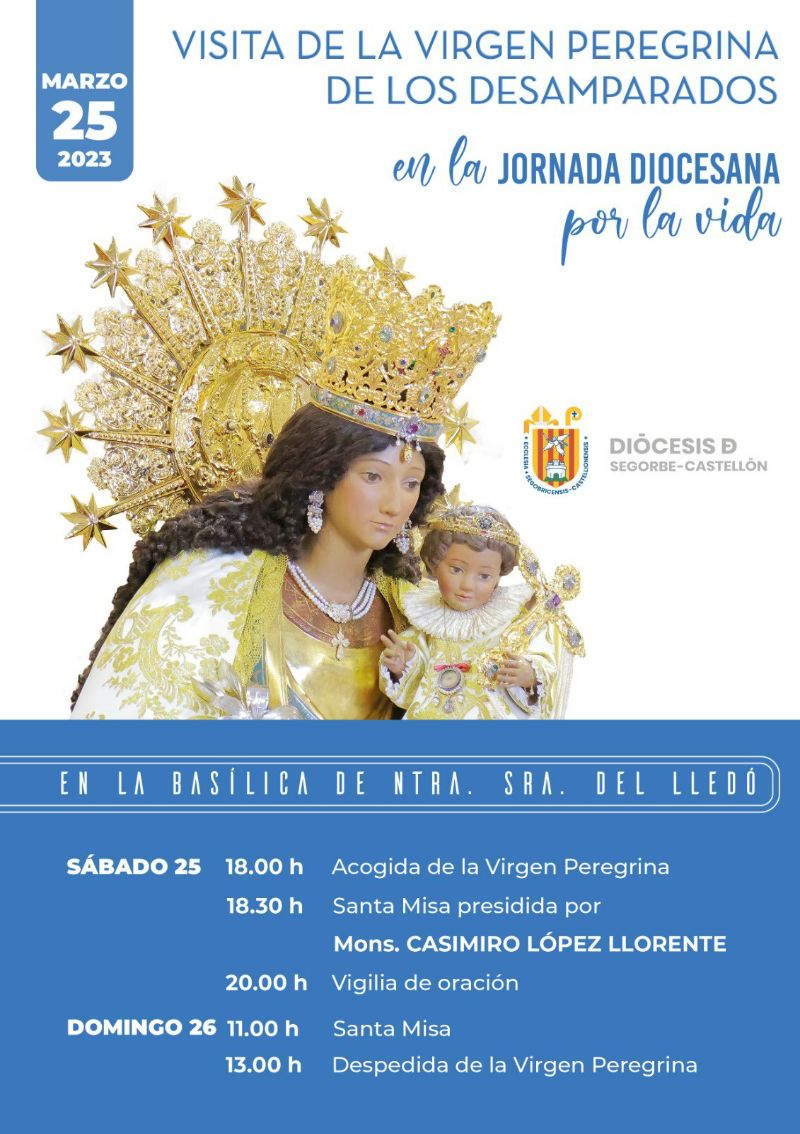 La acogida de la “Peregrina” tendrá lugar el sábado a las 18 horas en la Basílica del Lledó, donde a las 18:30 horas presidirá una Misa el Obispo de Segorbe-Castellón, monseñor Casimiro López Llorente. La jornada del sábado finalizará con una Vigilia de Oración a las 20 horas, cuya intención principal será la defensa de la vida, desde su concepción hasta su fin natural.