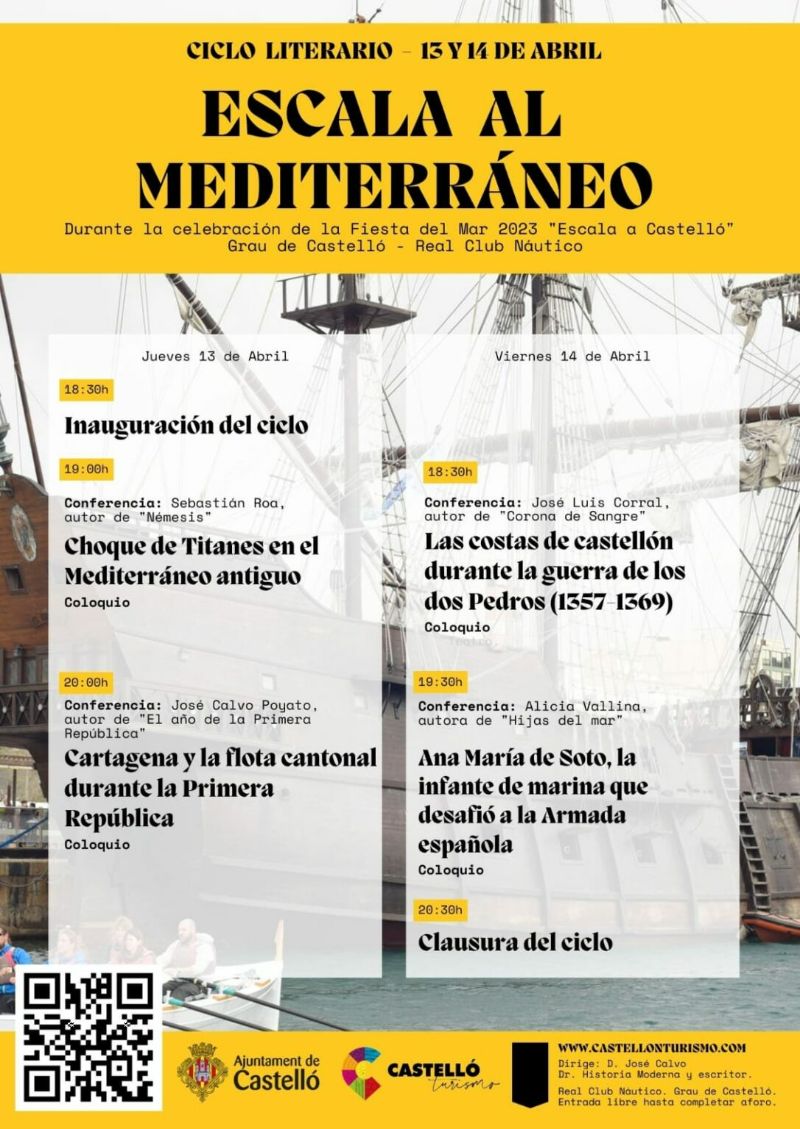 El Ayuntamiento de Castelló, a través del Patronato Municipal de Turismo, ha organizado un año más el ciclo de conferencias históricas ‘Escala al Mediterráneo’ que se celebrará el 13 y 14 de abril en el Real Club Náutico de Castelló. El ciclo dará comienzo este jueves a las 18.30 horas con la jornada de apertura para, seguidamente, ofrecer la conferencia ‘Choque de Titanes en el Mediterráneo antiguo’, por Sebastián Roa, autor de Némesis. El ciclo continuará a las 20.00 horas con la conferencia ‘Cartagena y la flota cantonal durante la Primera República’, a cargo de José Calvo Poyato, autor de El año de la Primera República.