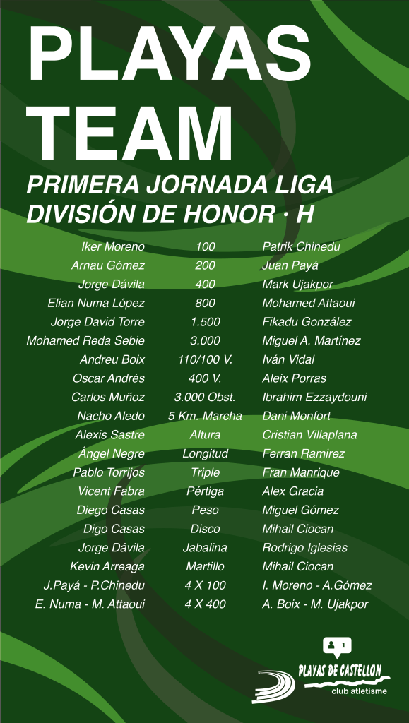 Aún así, el club alineará a primeras espadas que probablemente competirán en la final de la liga como son el capitán Pablo Torrijos en el triple o Alexis Sastre en la altura. También saltará a escena algunas de las icorporaciones de la temporada 2023 como Elian Numa y Mohammed Attaoui en los 800 metros, Jorge Torre en los 1.500 metros, Álex Gracia en la pértiga o Aleix Porras en los 400 vallas. También destacada presencia tendrá Diego Casas, que doblará prueba en peso y disco o el combinero Jorge Dávila, que disputará el 400 y la jabalina.