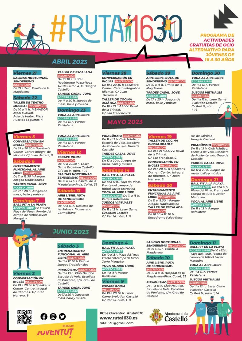 El Ayuntamiento de Castelló, a través de la Concejalía de Juventud, ha programado para este trimestre, de abril a mayo, 45 actividades de ocio dentro de la iniciativa #Ruta1630, que tendrán lugar en diferentes ubicaciones, como el parque Rafalafena, el Menador, la playa del Pinar o el Casal Jove, entre otras.