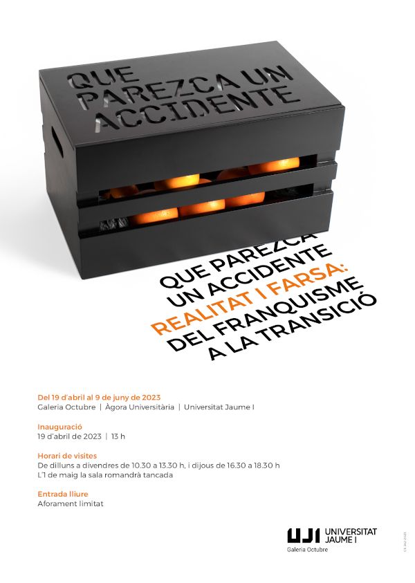 La Galería Octubre de la Universitat Jaume I de Castelló (UJI) inaugura hoy miércoles 19 de abril, a las 13.00 horas, la exposición “Que parezca un accidente. Realitat i farsa: del franquisme a la transició”, comisariada por el profesor de Estética y Teoría de las Artes, Joan M. Marín. La muestra podrá visitarse de forma gratuita hasta el próximo 9 de junio, en horario de lunes a viernes de 10.30 a 13.30 horas, y jueves de 16.30 a 18.30 horas. El día 1 de mayo, festivo, la sala permanecerá cerrada.