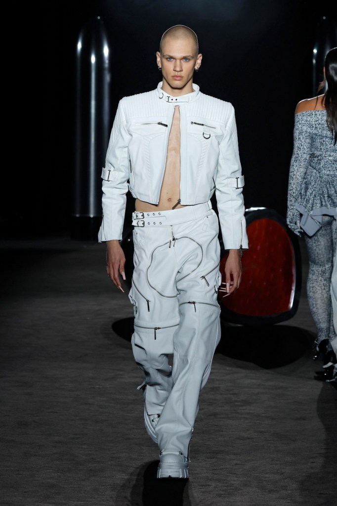 La vestimenta deportiva, el mundo del motor, las aplicaciones y fornituras con connotaciones sexuales son elementos clave en esta propuesta en la que no creamos ropa para montar en moto sino que utilizamos materiales y tejidos con los que podríamos revestir a la propia moto, comenta el diseñador.