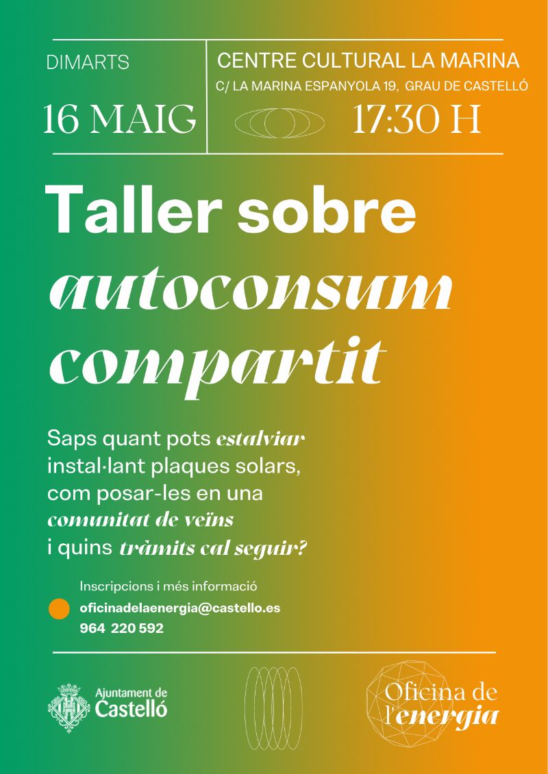La Concejalía de Transición Ecológica del Ayuntamiento de Castellón, a través de la Oficina de la Energía, ha organizado para el martes 16 de mayo un taller gratuito abierto a la ciudadanía sobre autoconsumo energético compartido. El acto será en el centro cultural la Marina del Grao, situado en la calle Marina Española 12. Las personas interesadas en inscribirse y en obtener más información pueden hacerlo a través del correo lectrónico oficinadelaenergia@castello.es o el teléfono 964220592.