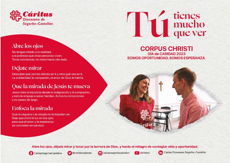 A partir del próximo lunes, 5 de junio, y teniendo como eje central la festividad, el jueves día 8, del Corpus Christi, Cáritas Diocesana de Segorbe-Castellón celebra la Semana de la Caridad, uno de los momentos más significativos durante todo el año para recordar y poner en valor la acción social que realiza Cáritas.