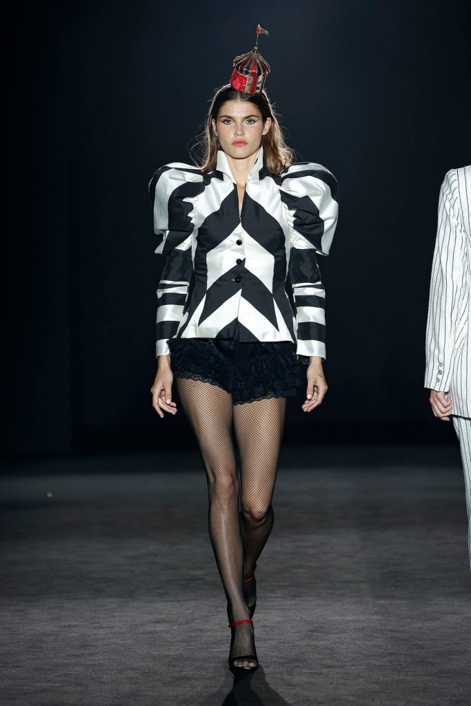 Volantes, blondas, rayas en tafetán de seda, camisas globo y corsés inspirados en finales del s.XIX. Tocados arriesgados, creados artesanalmente, junto a bordados de cristal en negro azabache evocando la magia, que nos transportan entre bastidores de ese ambicioso universo.