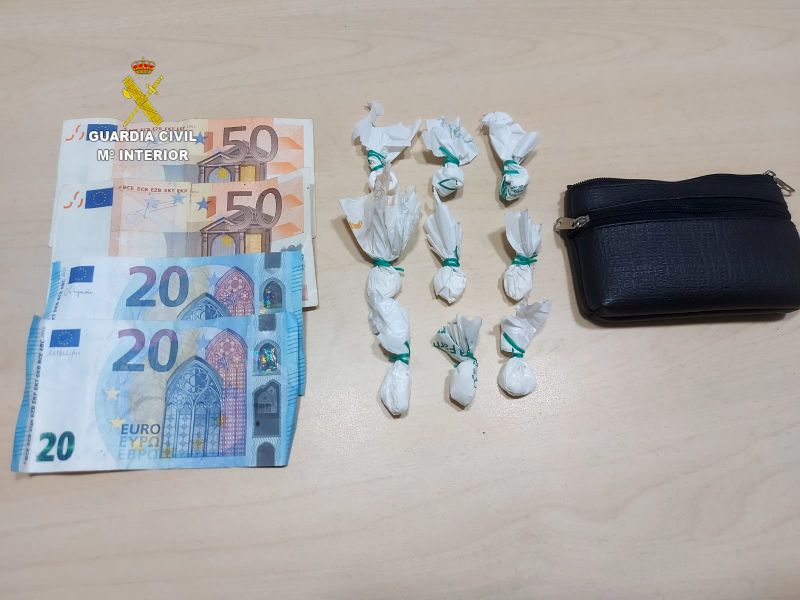 Verificada las pertenecías del ahora detenido, en su interior se encontraron dentro de una riñonera, 9 dosis al parecer de cocaína, 140 euros en moneda fraccionada, por lo que se le atribuye un delito de tráfico de drogas.
