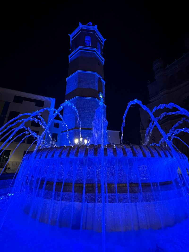 La iluminación de color azul se mantendrá hasta el domingo por la noche y el lunes ambos monumentos de la plaza Mayor de Castellón se iluminarán de amarillo a petición de la Asociación Española para el Síndrome de Rubinstein-Taybi con el objetivo de dar visibilidad a las personas que lo padecen.