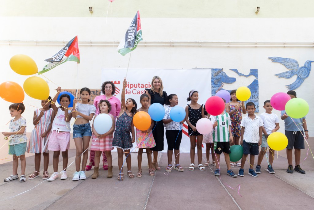 La presidenta de la Diputación Provincial de Castellón, Marta Barrachina, junto a la diputada de Bienestar Social, Marisa Torlà, ha recibido en el patio del Espai Cultural Obert Les Aules a los 14 niños saharauis y a sus familias de acogida que participan en el programa ‘Vacaciones en Paz’, un proyecto que lleva a cabo la Asociación de Amigos del Pueblo Saharaui Smara y gracias al cual menores que habitualmente viven en el desierto del Sahara puedan pasar el verano en territorio español.