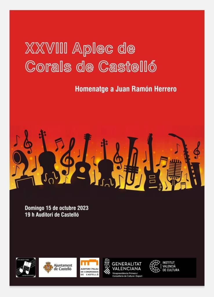La sala sinfónica del Auditorio de Castellón albergará el próximo domingo el XVIII Aplec de Corals, que contará con más de 200 voces sobre el escenario, procedentes de 10 corales castellonenses y el Coro de FECOCOVA, la federación valenciana de música coral. El Aplec de Corals, en homenaje a Juan Ramón Herrero, contará con la participación de la Coral Ad Libitum, el Cor Resurrexit, l’Ensemble Vocal Varadero, la Coral Juan Ramón Herrero, Veus Atrevides, Cor Pentecosta, Coro Innuendo, Orfeó de la Universitat Jaume I, Veus de Lledó i la Coral Vicent Ripollés, además del coro autonómico invitado.