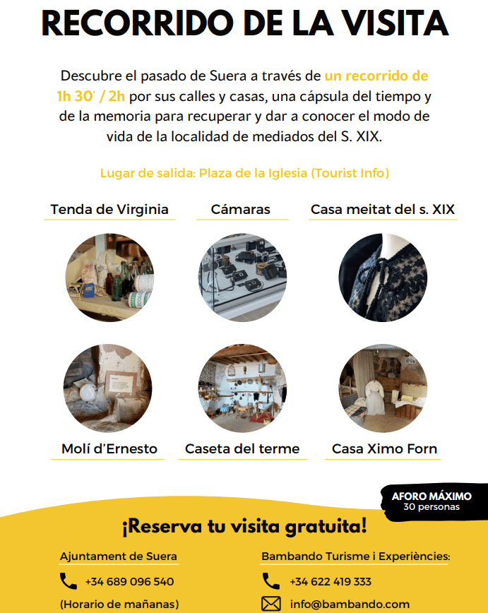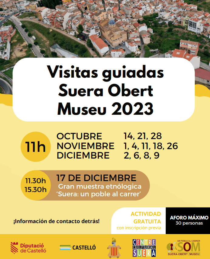 Las visitas guiadas están enmarcadas dentro de la iniciativa de SOM (Suera Obert Museu) creada por el Centro Cultural Sueras junto al Ayuntamiento del municipio a raíz de la muestra etnológica ‘Suera, un poble al carrer’, que se lleva a cabo desde 1997 y que ha sido reconocida como fiesta de interés turístico autonómico. De hecho, el cierre del ciclo llegará de la mano de la celebración del popular evento, que tendrá lugar el 17 de diciembre y, por ese motivo, esa jornada habrá dos recorridos guiados, uno a las 11.30 y otro a las 15.30 horas.