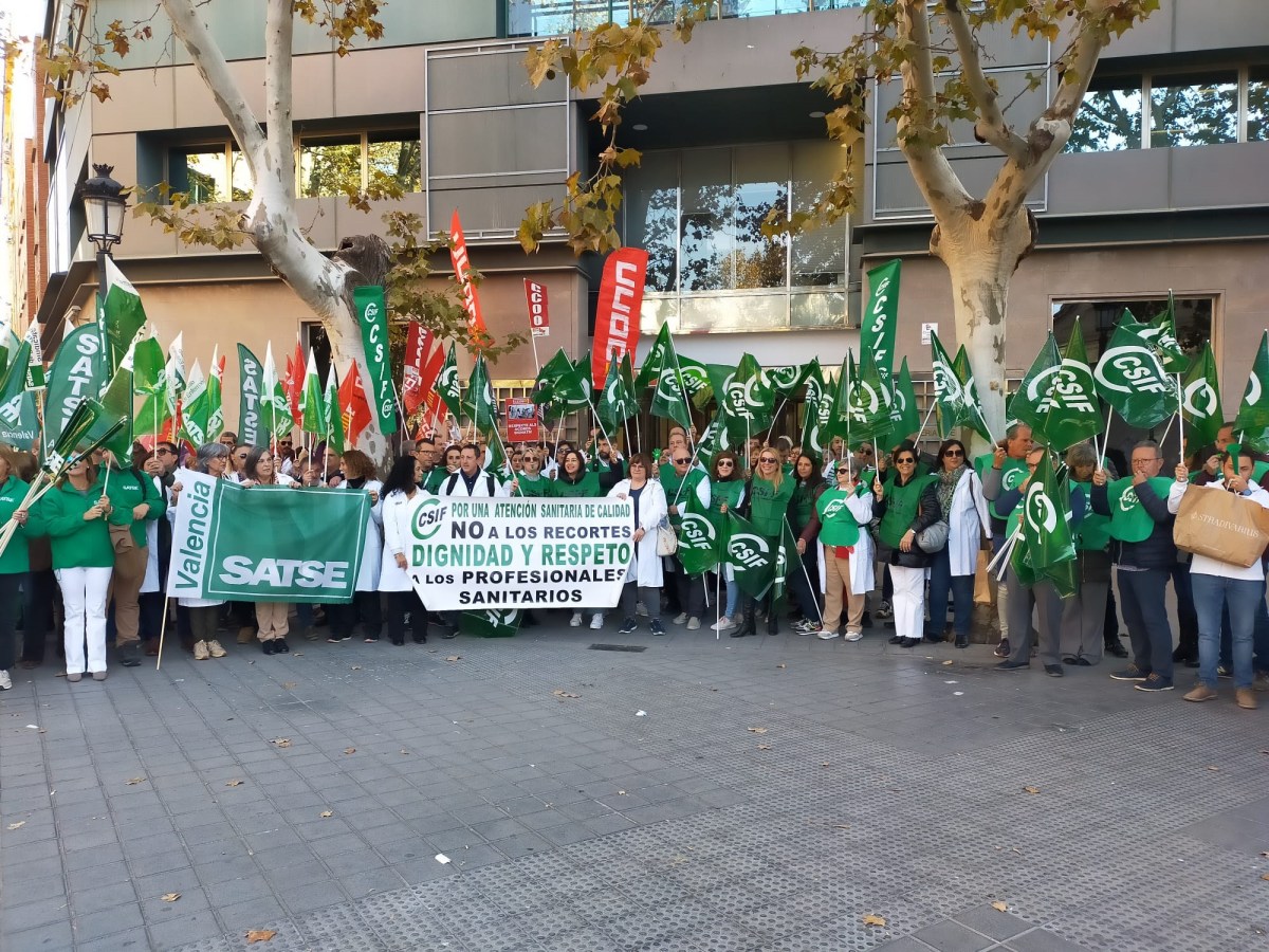 Los sindicatos de Mesa Sectorial de Sanidad (SATSE, CCOO, UGT, CSIF e INTERSINDICAL VALENCIANA) han celebrado una una concentración, frente a la Conselleria de Sanidad, para reclamar que se cumpla en acuerdo firmado el 8 de marzo que fijaba la implantación progresiva de las 35 horas semanales desde 2023 hasta 2025.