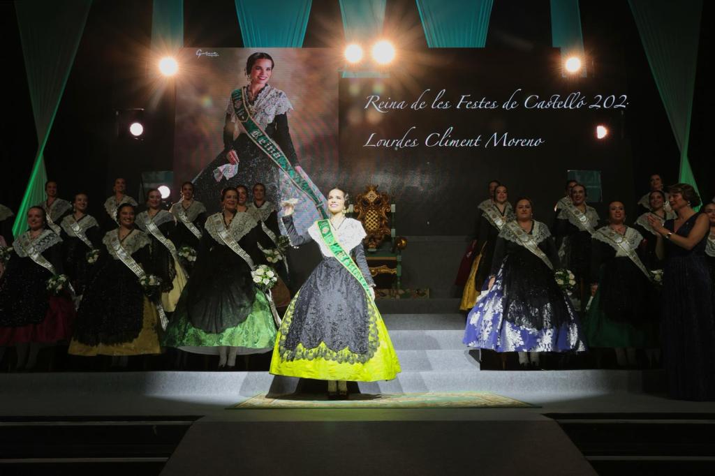Llegó uno de los momentos culminantes de la noche: el acceso al escenario, escoltada por la Escuadra de Honor de la Policía Local de Castellón y acompañada por la música de Xarançaina, de la Reina de las Fiestas de Castellón 2024, Lourdes Climent Moreno.