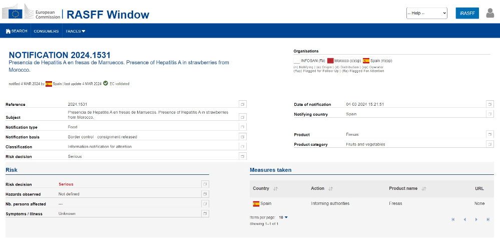 La Asociación Valenciana de Agricultores (AVA-ASAJA) muestra su “preocupación” y exige “medidas urgentes” al Gobierno central y a la Unión Europea (UE) ante una notificación emitida ayer en el portal comunitario RASFF (Rapid Alert System Feed and Food) que alerta de “presencia de Hepatitis A en fresas de Marruecos” detectada en un punto de entrada de España. Según dicha notificación, la decisión de riesgo es “serio” porque supera el “nivel máximo permitido ausencia/25g” de esta sustancia que AVA-ASAJA subraya que “supone un peligro para la salud pública y que puede haber aparecido en el alimento por regar las explotaciones con aguas fecales”.
