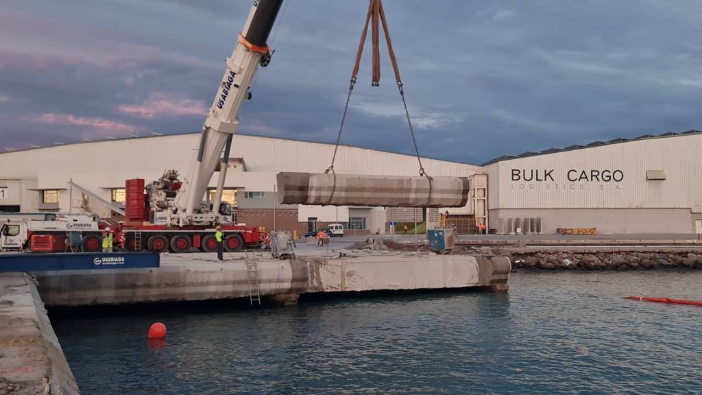 Se han demolido ya las losas en claraboya entre pantallas del muelle talón y 2 tramos de losas en claraboya entre cajones del muelle transversal. Tras perforar verticalmente la losa por distintos puntos, se realizan cortes longitudinales con hilo diamantado. Posteriormente se sujeta la pieza parcialmente cortada al lanzavigas, y se procede a realizar los cortes transversales y una vez la pieza (de unas 130 t) queda suelta y suspendida, se procede a su izado y desplazamiento hacia el interior del muelle. Una vez allí, el siguiente paso es su demolición con martillo hidráulico separando el acero del hormigón mediante un imán para así poder realizar una gestión óptima del material extraído.
