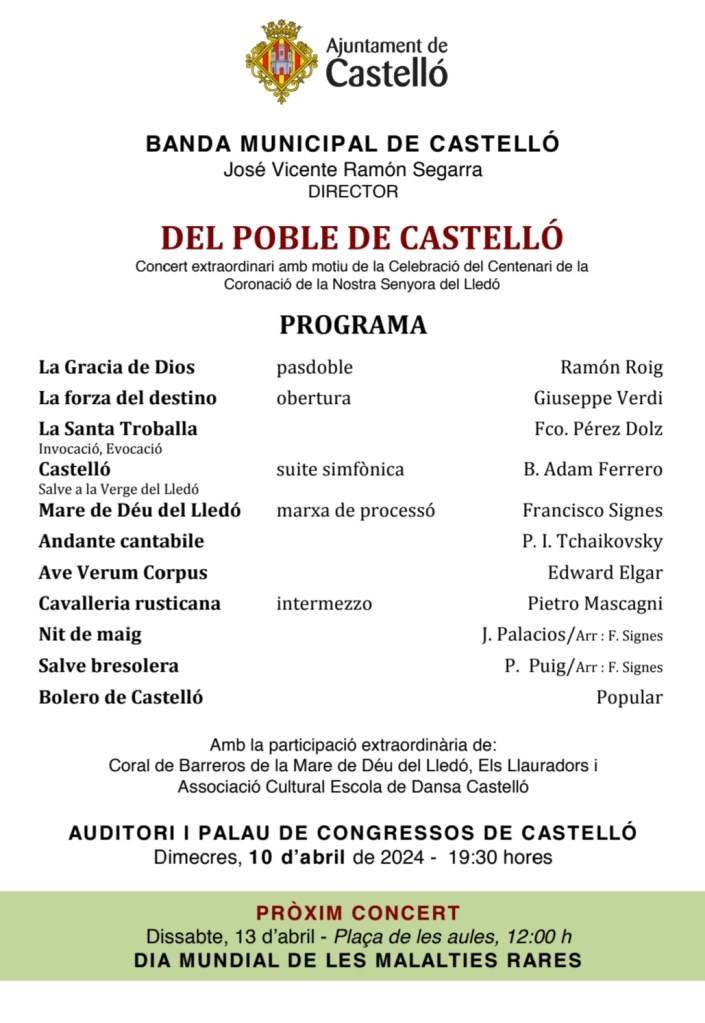 El concierto comenzará, como ya es habitual, a las 19,30 horas y contará con la participación extraordinaria de la Coral de Barreros de la Mare de Déu del Lledó, Els Llauradors y la Asociació Cultural Escola de Dansa Castelló.