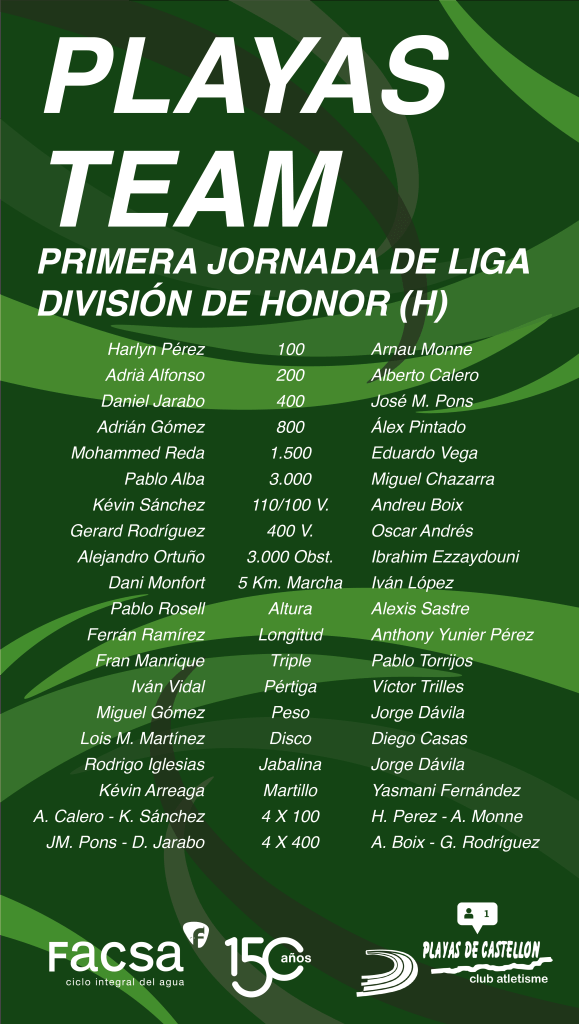 Para esta primera jornada el Facsa Playas presenta equipos repletos de atletas locales y categorías inferiores, como viene siendo habitual, en una apuesta por el crecimiento de la cantera. Aun así, habrá internacionales absolutos como como el capitán Pablo Torrijos, que defenderá el triple, las velocistas Esther Navero y Paula Sevilla, que se centrarán en el 400 y el 200 respectivamente o la plusmarquista nacional de peso Belén Toimil.