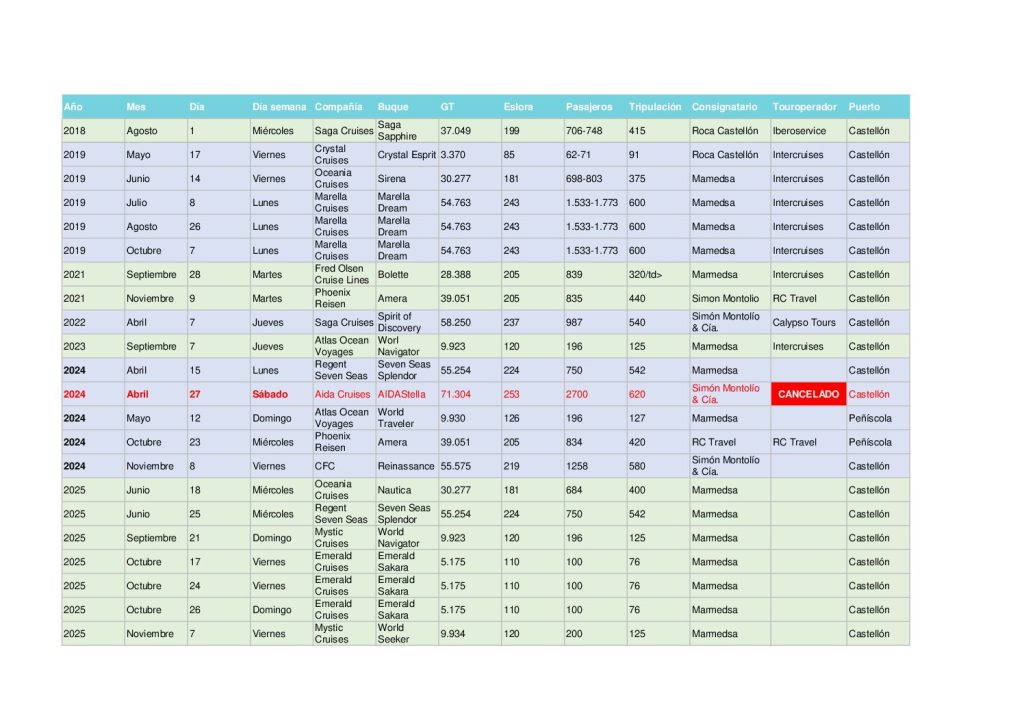 El máximo responsable de la Autoridad Portuaria de Castellón ha recordado que se han cerrado ya 11 escalas de cruceros para los dos próximos años. “Castellón tiene muchos atractivos turísticos únicos en España, y trabajamos para que las empresas del sector crucerístico elijan Castellón como puerto de escala en sus itinerarios”. «El puerto de Castellón es una infraestructura ideal para acoger este tipo de tráfico, a 4 kilómetros de la capital y con una extraordinaria conexión puerto-ciudad, lo que permitirá crecer en esta industria, ya que la región puede ofrecer enormes enclaves turísticos, lo que encaja perfectamente con las navieras que busquen factores diferenciales y únicos», concluye Rubén Ibáñez.