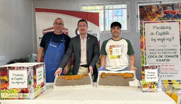 Por cada compra en el mercado de San Antonio la concejalía de Comercio y Consumo ha repartido esta mañana un trozo de coca de tomate gratis. Se han repartido un total de 180 trozos para premiar a los vecinos comprometidos con el comercio local de Castellón.