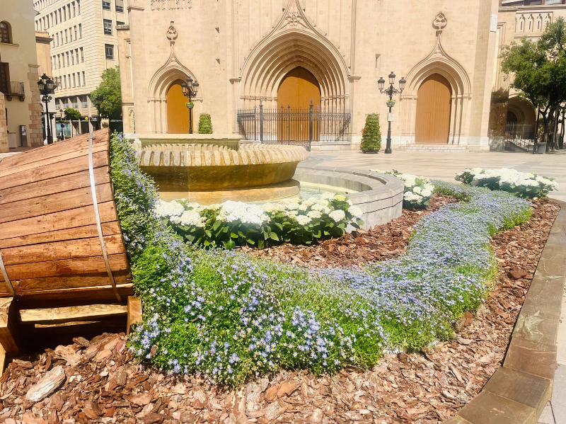 Los trabajos se realizarán en dos fases. La primera, que se está llevando a cabo en estos momentos, contempla la instalación del nuevo sistema de riego localizado mediante tuberías con goteros integrados, la sustitución de flores de plástico por flores naturales y la colocación de césped natural en las jardineras. La segunda fase prevé la sustitución del césped artificial por natural en los alcorques