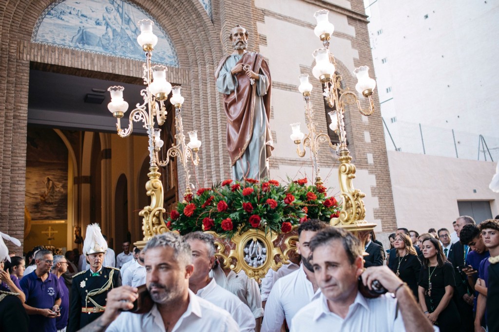 La comitiva ha formado junto a la Iglesia de San Pedro Apostol y ha recorrido las calles Churruca, Avenida del Puerto, Treballadors de la Mar desde donde se ha accedido al recinto y la dársena pesquera donde han embarcado las imágenes de San Pedro y de la Virgen del Carmen, navegando por unos minutos en las aguas de la dársena.