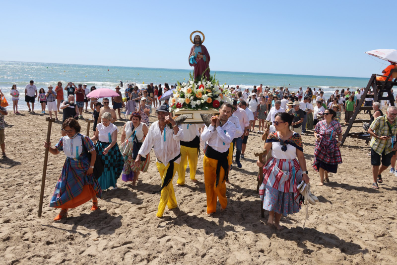 Pantalones amarillos y camisa blanca. Cuatro hombres de La Ribera han llevado la peana desde la barca hasta Torre de la Sal, donde se ha oficiado la misa tal como marca la tradición. Una procesión única junto al Mediterráneo, que mantiene viva una de las tradiciones más arraigadas en el pueblo.