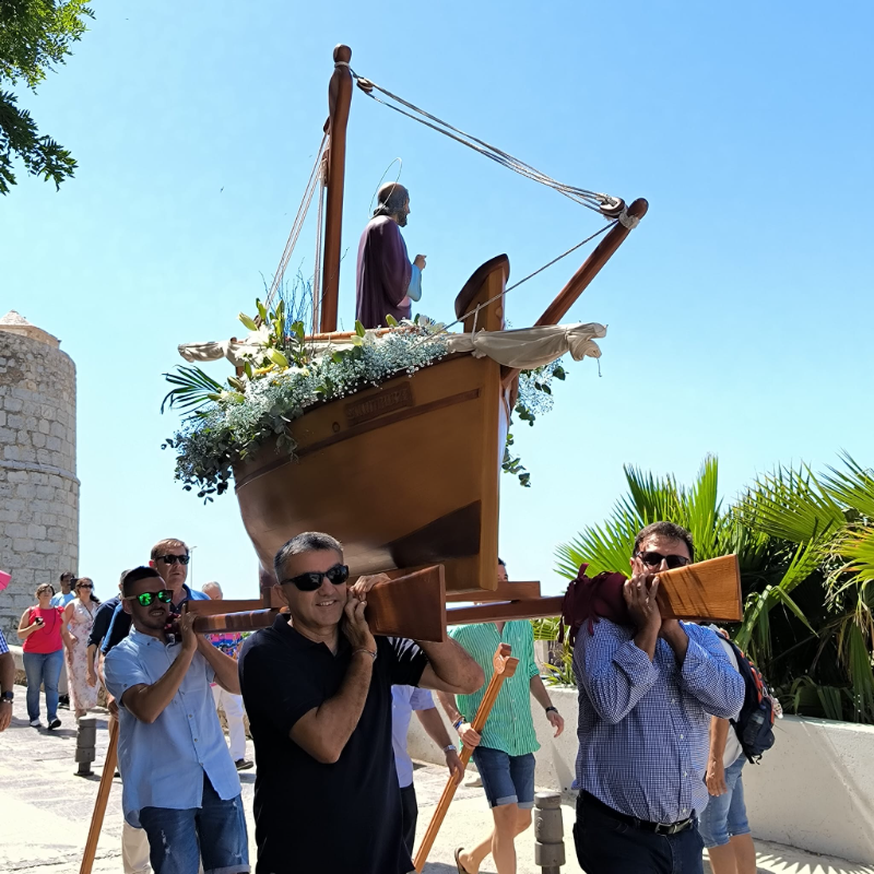 Tras la celebración litúrgica se ha iniciado la procesión de la imagen del patrón de los marineros por las empedradas calles de la ciudad, encabezada por los miembros del Cabildo de la Cofradía, la Corporación Municipal con el Alcalde, Andrés Martínez, a la cabeza, así como la Corte de Honor de las Fiestas Patronales.
