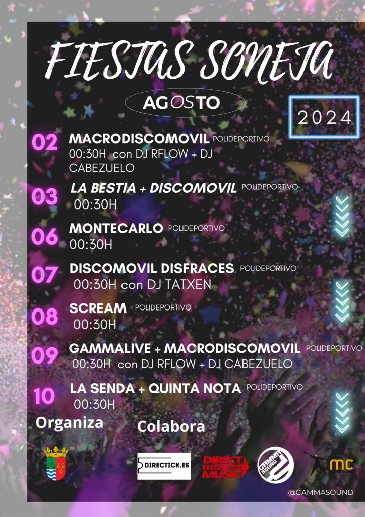 El calendario tendrá lugar entre el 4 y el 9 de agosto y en estas sesiones, que se llevarán a cabo a las 22:00 horas, participarán Grupo Chanela, Tentando la Suerte, Zoomba Party, Kasparov, La Clave y Tributo Fito. En la previa final, el sábado 10 de agosto a las 17:00 horas, se llevará a cabo una discomóvil vespertina.