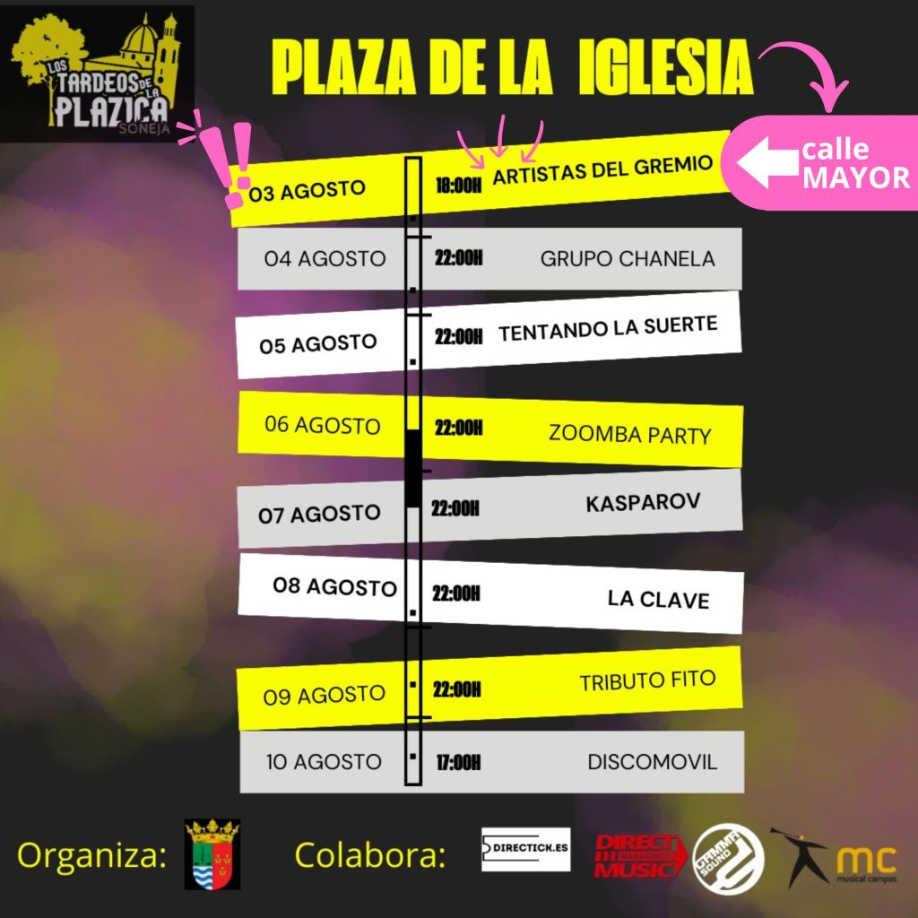 La animación musical será una de las piezas centrales de estas fiestas. Vuelven las sesiones de ‘Tardeos en la Plazica’, organizadas por el Ayuntamiento en colaboración con diferentes entidades en la Plaza de la Iglesia, tras el éxito del año pasado.