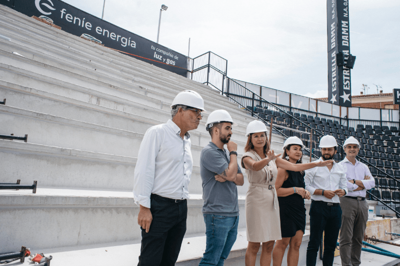 La alcaldesa de Castellón, Begoña Carrasco, la edil de Deportes en el Ayuntamiento, Maica Hurtado y el concejal de Urbanismo, Sergio Toledo han visitado las instalaciones del estadio SkyFi Castalia junto con con Jordi Porcar responsable del estadio e instalaciones y Juan Vicente Pallarés director de construcción de la empresa Civicons, adjudicataria del proyecto de remodelación, para comprobar in situ el estado de las obras de remodelación y adecuación de la grada de preferencia.