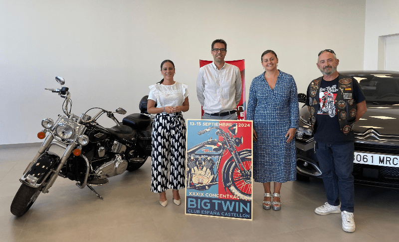 La teniente alcalde del Grao, Ester Giner, ha asistido a la presentación de la XXXIX edición Big Twin España, una concentración que reúne cada año a moteros de Harley Davidson de toda Europa en la capital de la Plana. Esta edición se celebrará el fin de semana del 13 al 15 de septiembre y se prevé la asistencia de más de 1.000 personas procedentes de clubes españoles y de colectivos extranjeros de países como Francia, Irlanda, Reino Unido, Holanda o Alemania. En este acto han estado también presentes Jorge Ortiz Marcó, presidente Big Twin España, y Sergio Garbi, responsable de marqueting de Garage Castellón, entre otros.