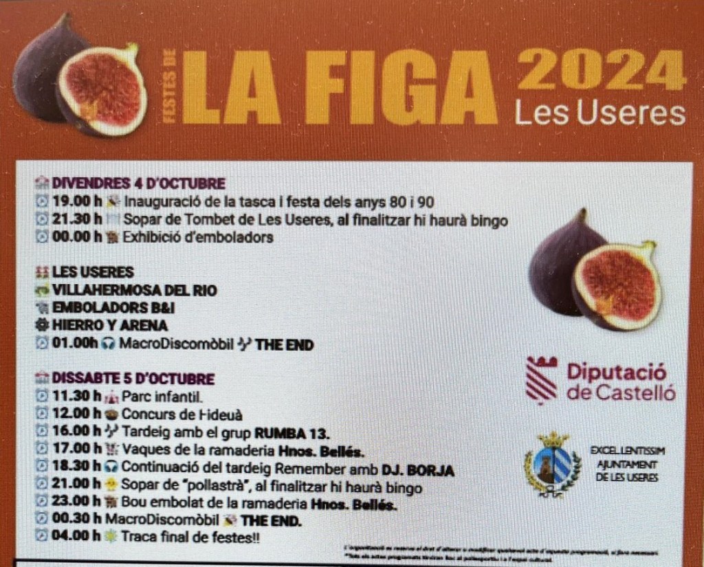 La presente edición de les ‘Festes de la Figa’ de les Useres se inaugurará a las 19.00 horas de mañana viernes, 4 de octubre, con la apertura de la tasca y una fiesta dedicada a los años 80 y 90. Además, entre otras iniciativas, esa noche los asistentes podrán disfrutar de una cena popular a base de ‘tombet de Les Useres’ a la que seguirá una exhibición de emboladores a partir de la medianoche y una macrodiscomóvil, con The End.
