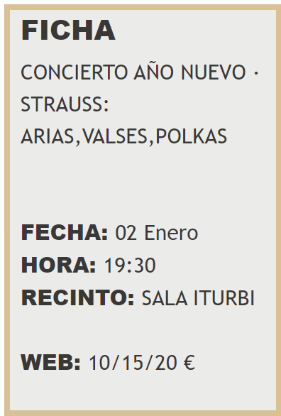 Se trata del Concierto Extraordinario de Año Nuevo donde podremos disfrutar de arias, valses y polkas de J. Strauss II, G. Puccini, J. Offenbach y P. I. Chaikovski, entre otros.