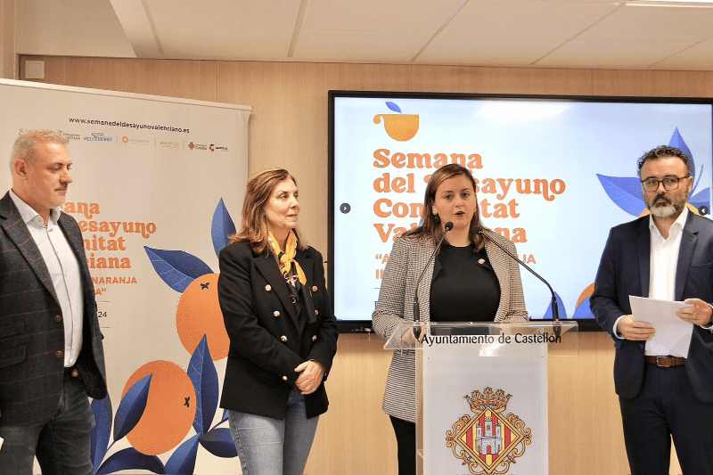 La concejal de Turismo, Arantxa Miralles, ha presentado junto a Yolanda González, directora comercial de ASHOTUR; José Enrique Sanz, gerente de IGP Cítricos Valencianos; e Israel Martínez, director general de Turisme Comunitat Valenciana, una nueva edición de la Semana del Desayuno Valenciano que llega por primera vez a la capital de la Plana con un total de 19 establecimientos adheridos. Este evento, que se celebrará del 9 al 13 de diciembre de 2024, tiene como objetivo poner en valor el sector agrario y apoyar a los establecimientos hosteleros de la ciudad de Castellón.