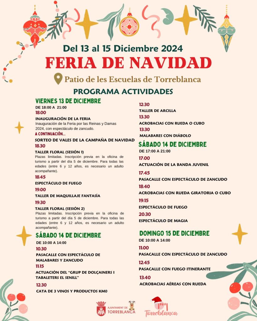 Por la tarde, estará la actuación de la banda juvenil (17.00 horas), y varios espectáculos para captar la asistencia de los vecinos y el público en general: malabares, magia y fuego marcarán el sábado por la tarde. Además, el sábado desde las 10.30 y hasta 12.30, así como desde las 17.00 a las 19.00 Torreblanca contará con la presencia de Papá Noel para que los niños puedan entregar sus cartas con sus deseos para el día 24 de diciembre. El domingo 15 desde las 10.00 a las 14.00 se celebrará esta feria con diferentes espectáculos.
