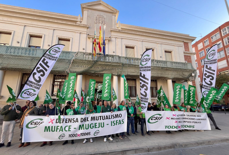 El presidente de CSIF en Castellón, Javier Estrada, ha dado lectura a un manifiesto en el que ha recordado que, «tras salir a la calle el pasado 11 de noviembre, manifestarse el sábado día 14 de diciembre en Madrid en defensa del mutualismo administrativo y por la continuidad del MUFACE, hoy salimos de nuevo a la calle para exigir al Gobierno que desbloquee la negociación colectiva de las condiciones laborales y que convoque la Mesa General de las Administraciones Públicas para abordar cuestiones como la negociación del nuevo acuerdo salarial, ya que el actual caduca a final de año y ha provocado una pérdida de poder adquisitivo del 6% desde 2022, así como la oferta de empleo público para 2025».