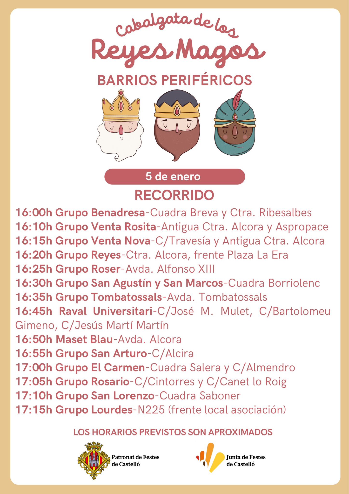 A las 16:00h está prevista la llegada de los Reyes a los barrios periféricos, recorriendo los siguientes grupos: Benadresa, Venta Rosita, Venta Nova, Reyes, Roser, San Agustín y San Marcos, Tombatossals, Raval Universitari, Maset blau, San Arturo, El Carmen, Rosario, San Lorenzo y Grupo Lourdes.
