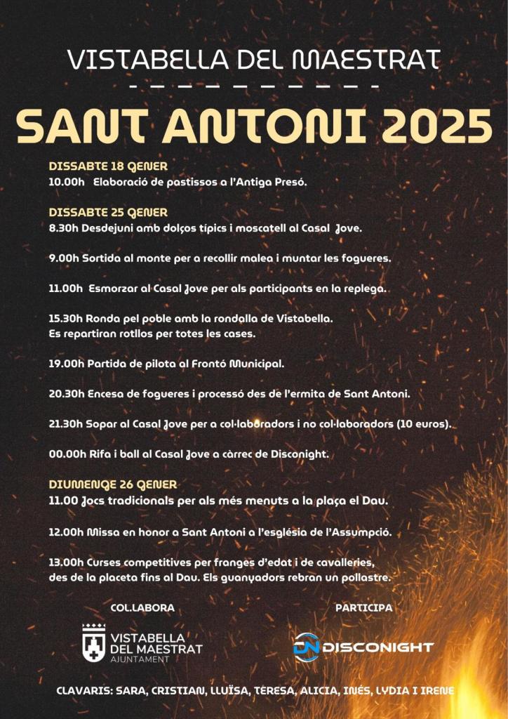 Todos los actos preparados han sido organizados por los Clavarios de Sant Antoni 2025, formado por Sara, Alicia, Lluïsa, Lydia, Teresa, Inés, Irene y Cristian con la colaboración del Ayuntamiento de Vistabella del Maestrat.