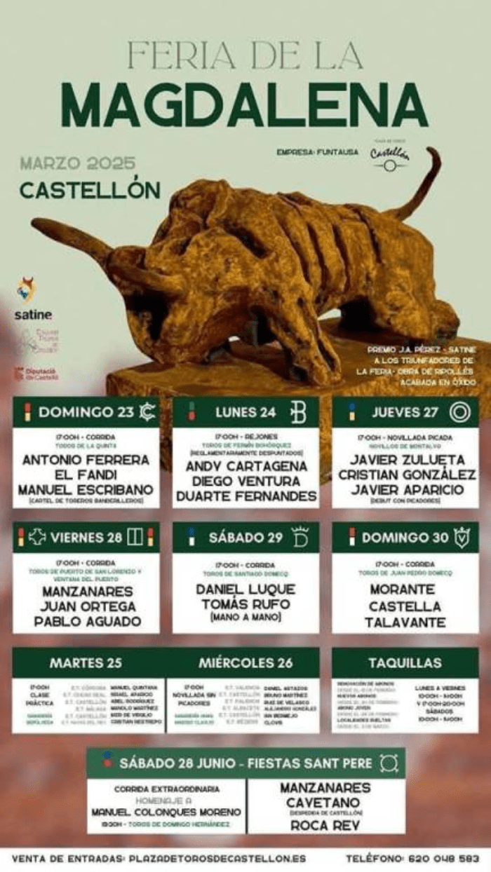 En este sentido Carrasco ha destacado que “la Feria Taurina de la Magdalena siempre es un reclamo para aficionados de casa, pero también de fuera de nuestra ciudad y de la provincia. Es un incentivo cultural y turístico más, de nuestras fiestas fundacionales declaradas de Interés Turístico Internacional, que consigue poner a Castellón en el mapa. Y un incentivo más, para la reactivación de la economía local, para esa ciudad viva que queremos”.