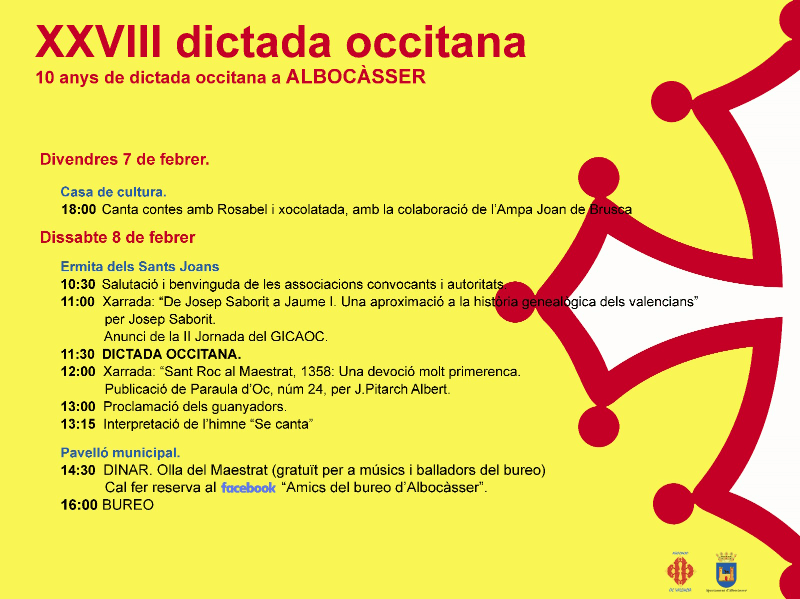 El Ayuntamiento de Albocàsser, en colaboración con varias asociaciones y colectivos locales, celebrará el próximo mes de febrero la 28.º edición de la Dictada Occitana, un acontecimiento cultural consolidado que celebra este año una década de historia en el municipio. La cita, que tendrá lugar en diferentes espacios de la localidad, contará con actividades para todas las edades en recuerdo de los 817 años del nacimiento de Jaume I en Montpelier.