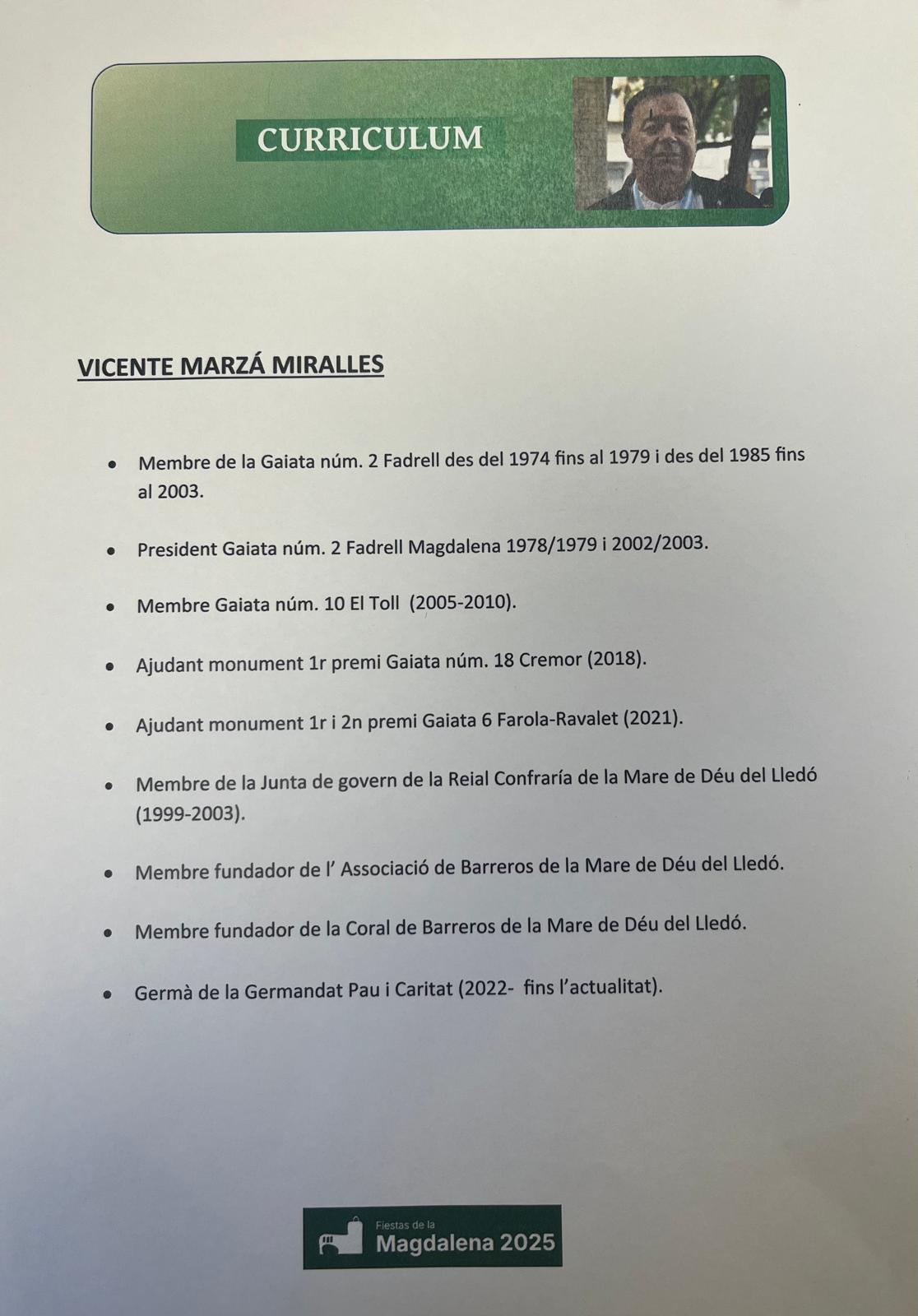 De Vicente Marzá, la primera edil ha destacado su larga vinculación a las Gaiatas y como miembro de la Junta de Gobierno de la Real Cofradía de la Mare de Déu del Lledó. “Es miembro fundador de la Asociación de Barreros de la Mare de Déu del Lledó y también es miembro fundador de la Coral de la Mare de Déu del Lledó, demostrando gran devoción por la patrona y un fuerte arraigo a las tradiciones”