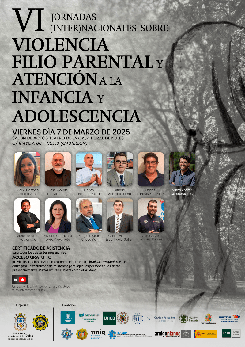 Esta edición contará con la incorporación en la programación de una mesa jurídica con Alfredo Abadías Selma, doctor en Derecho Penal y Presidente de SEVIFIP; Carlos Vázquez González, doctor en Derecho y profesor de la UNED; y de Carlos Vicente Escorihuela Gallén, Fiscal Delegado de la Sección de Menores de la Fiscalía Provincial de Castellón, quienes expondrán sus posturas sobre la violencia filioparental relacionada con cuestiones penales y criminológicas.