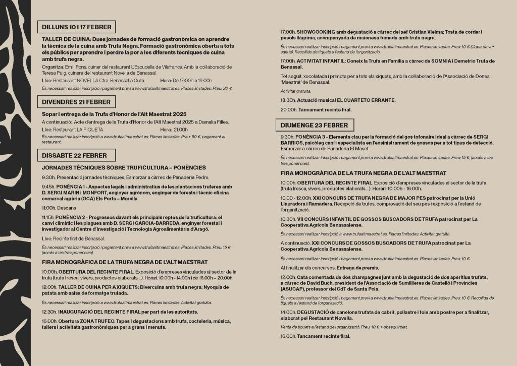 La feria retomará su actividad el 21 de febrero, con una cena el Restaurante La Piqueta en la que se celebrará el acto de entrega de la Trufa d’Honor de l’Alt Maestrat 2025, un reconocimiento especial que este año recibirá Damalia Filles.
