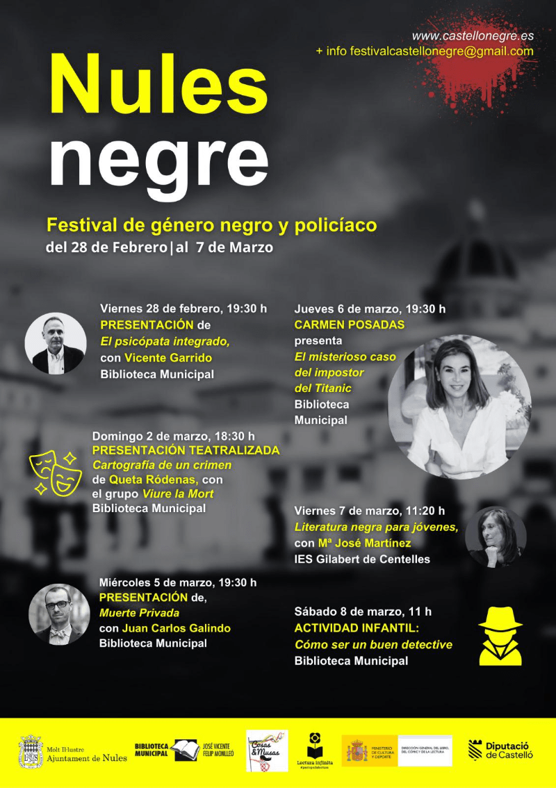 Nules inaugura este viernes, 28 de febrero, una nueva edición de Nules Negre, con una apuesta por la literatura de calidad y con una gran variedad de propuestas para atraer a diferentes públicos tanto infantil, juvenil como adulto. De manera que, con la celebración de esta programación Nules se convierte en una de las subdelegaciones más veteranas del Festival Castelló Negre.