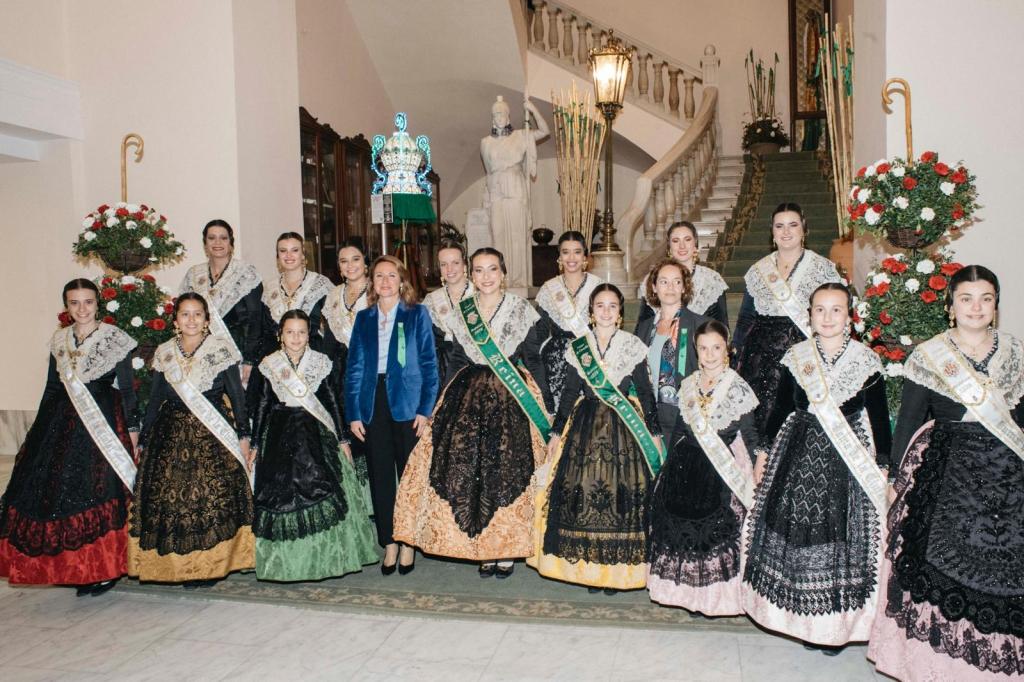La alcaldesa, acompañada de la concejala de Fiestas, Noelia Selma, ha recibido a las máximas representantes de las fiestas de la ciudad, las Reinas Paula Torres y Carla Ibáñez, junto a las Damas de la Ciudad en los porches del ayuntamiento para proceder a su interior y dar inicio al espectáculo.