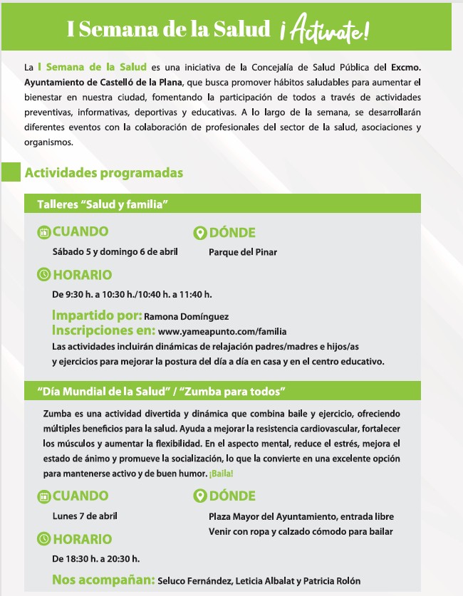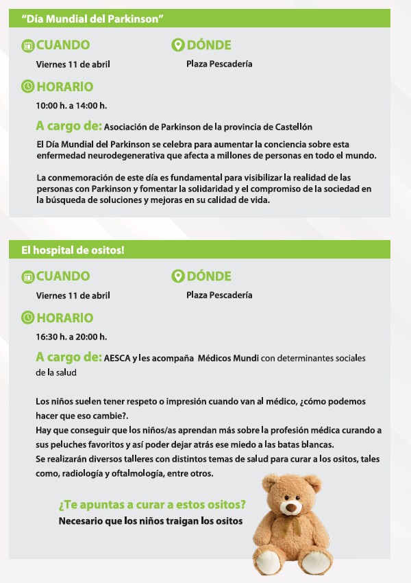 Miércoles 9, de nuevo en la Plaza Pescadería, se reunirán parte de las carpas corporativas de todas las asociaciones castellonenses relacionadas con la salud, el resto lo harán en el mismo lugar el jueves día 10.