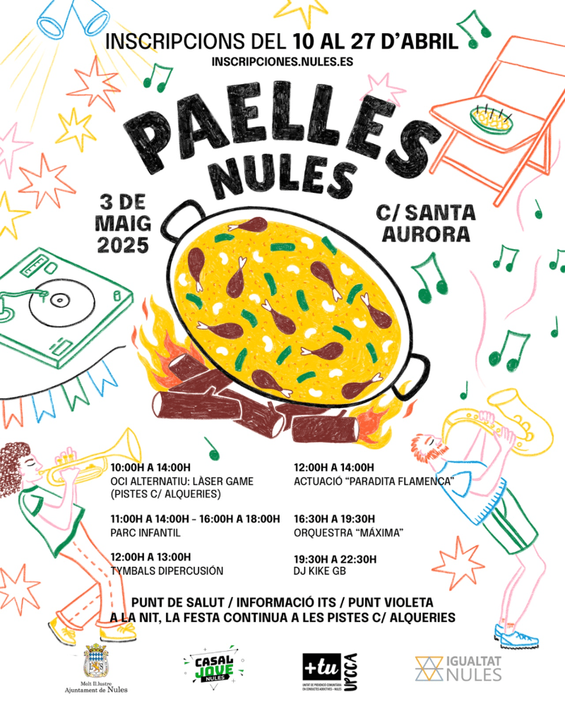 Así, como novedad se quiere que este evento se convierta también en un punto de referencia sobre inclusión, de manera que actuará, por primera vez, para animar la fiesta “Tymbals diPercusió”, un grupo de percusión que está formado por personas con diversidad funcional, “desde este grupo se pretende conseguir la inclusión social y cultural utilizando como motor el lenguaje musical, el poder de los tambores, y la propia diversidad de cada una de las personas que integran esta agrupación musical, por tanto, que mejor que tenerlo en las calles de Nules el Día de Paellas para animar a las personas participantes y darles así visibilidad”, comenta la Concejal de Juventud, Blanca Silvestre.