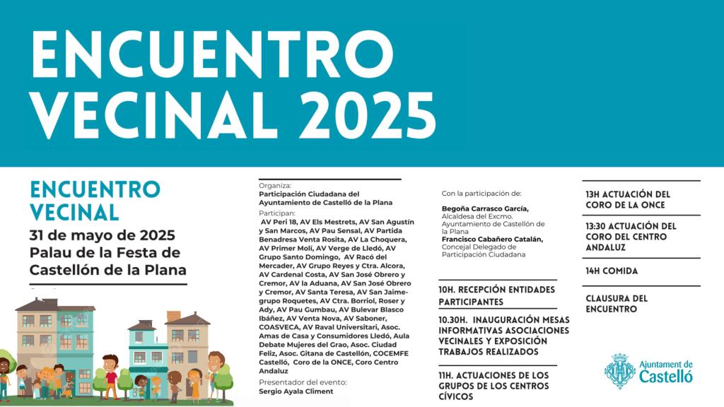 El Ayuntamiento de Castellón, a través de la Concejalía de Participación Ciudadana, organiza y recupera por segundo año consecutivo el Encuentro Vecinal 2025.