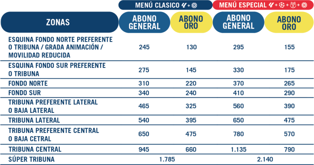- Carnet Joven: continuamos aplicando el descuento del 50% a los menores de 26 años (nacidos a partir del (01/01/2000) en todas las zonas del estadio, excepto Súper Tribuna.
