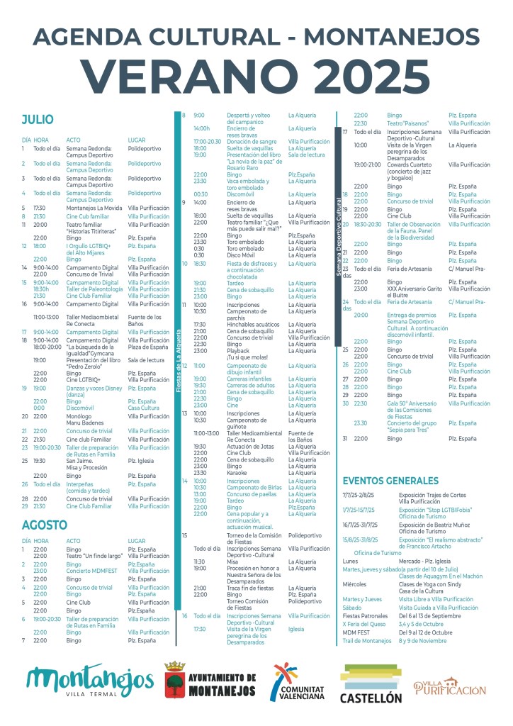 Villa Purificación será de nuevo la sede de buena parte de las propuestas culturales del verano en Montanejos, con sesiones del cine club familiar, así como propuestas como el teatro “Historias Titiriteras”, la comedia “Un finde largo”, el monólogo de Manu Badenes o el festival La Movida. Las noches se animan también con concursos de trivial, conciertos como el del cuarteto Cowards, de jazz y boogaloo, o el esperado concierto de presentación del MDM FEST.