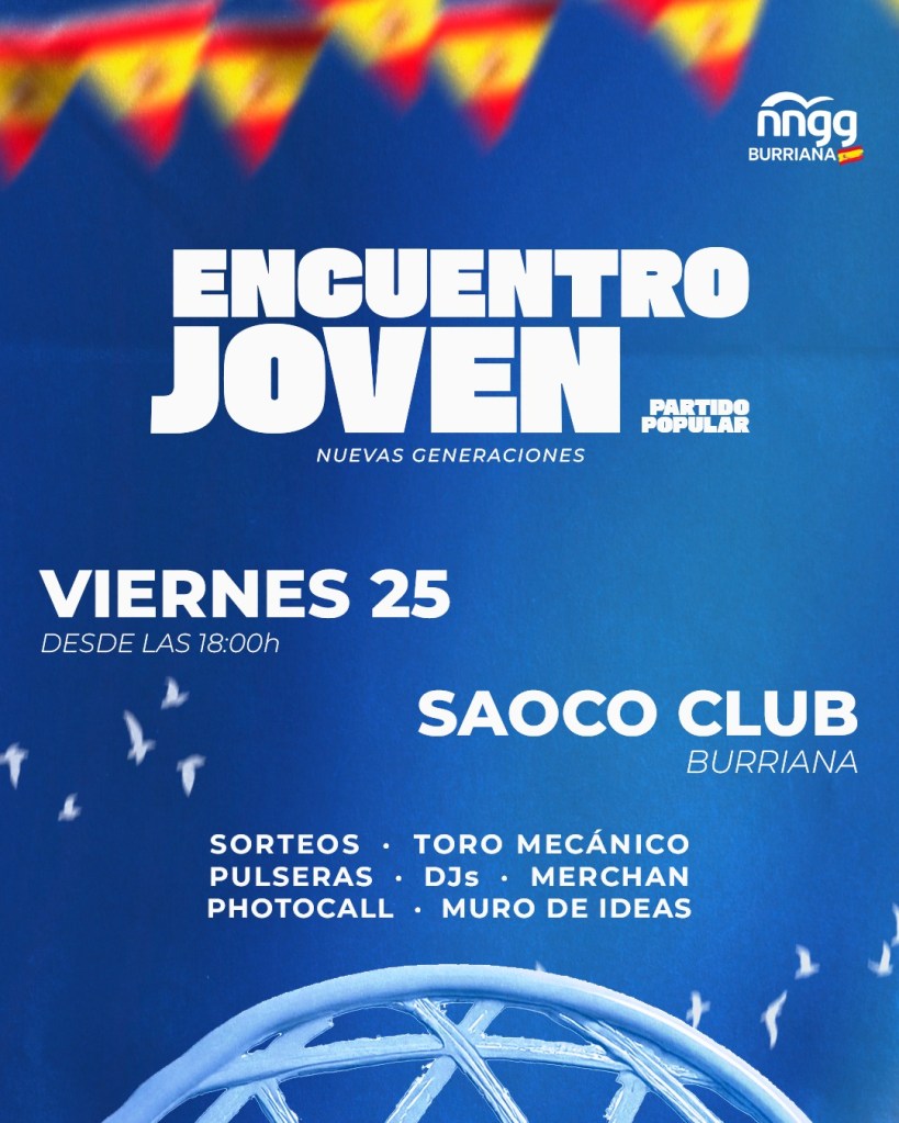 El Partido Popular de Burriana ha organizado un encuentro para acercar la actualidad política y la gestión municipal a los jóvenes de la capital de la Plana Baixa. La cita será el próximo viernes 25 de julio a las 18:00h en el chiringuito Saoco de la playa de Burriana.